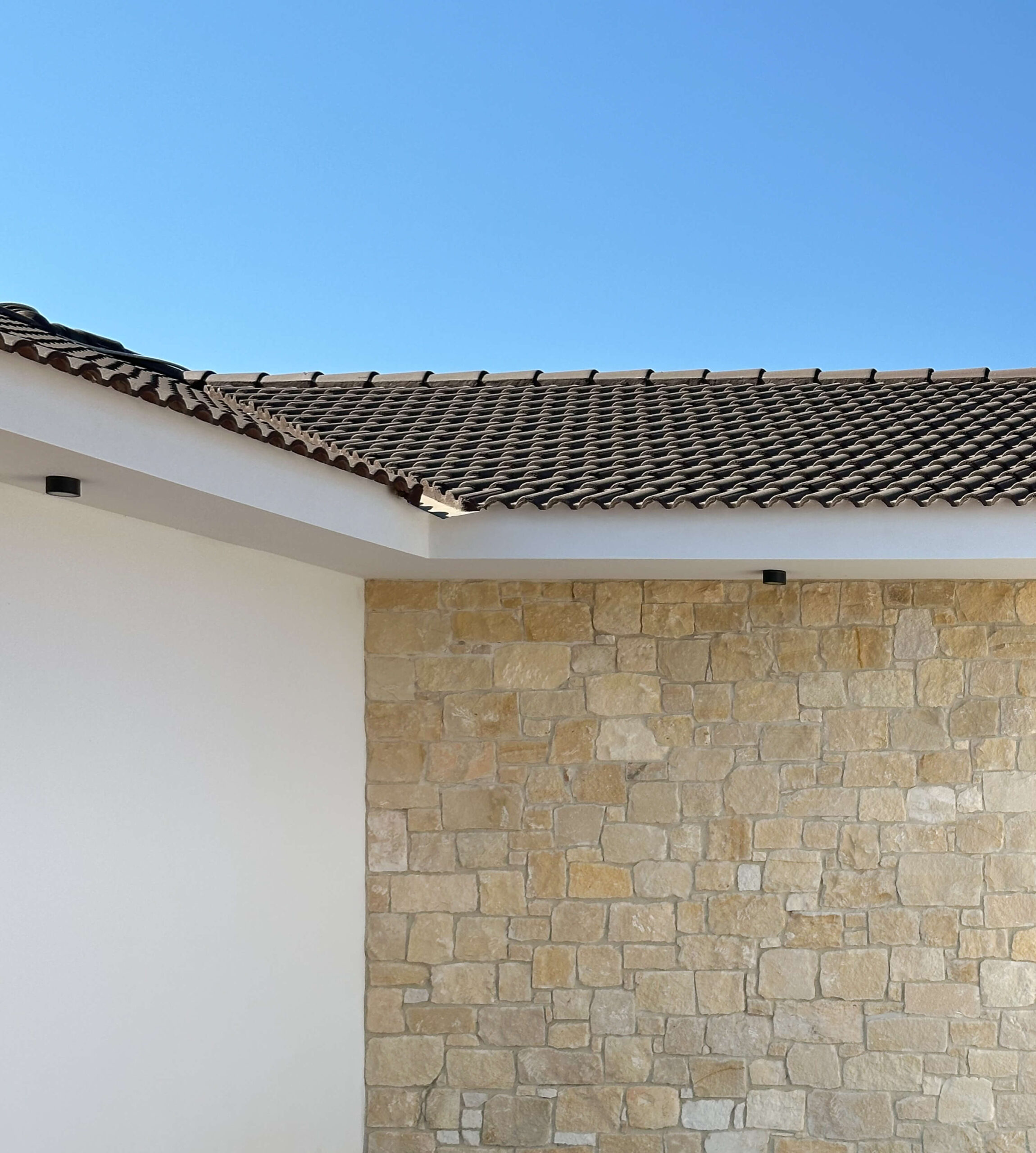 Η βαθιά καφέ απόχρωση της στέγης δημιούργησε αντίθεση με τις λευκές επιφάνειες του κτιρίου και συνδυάστηκε φυσικά με τη γήινη πέτρα της όψης, δίνοντας στο σπίτι ζεστασιά και έναν ήρεμο, διαχρονικό χαρακτήρα.